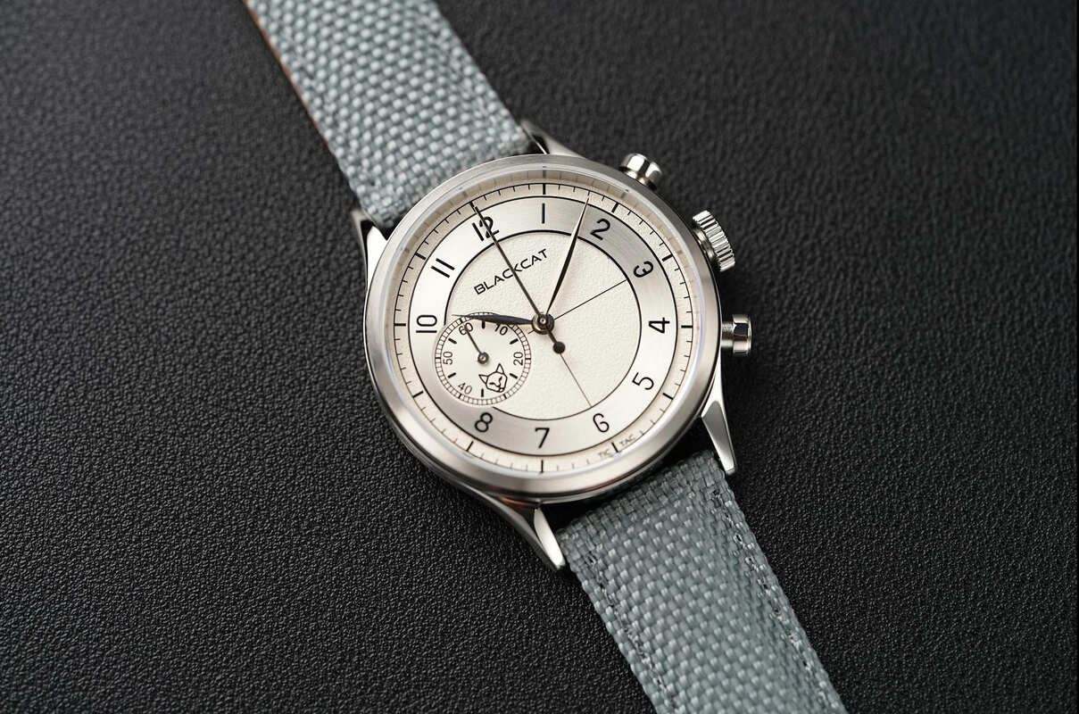 Le cadran de la BlackCat Shaka Silver séduit par l’équilibre entre élégance et caractère. Les chiffres arabes, le chemin de fer et le sous-compteur des minutes à 9 heures composent un ensemble au style néo-vintage particulièrement envoûtant. Face à la lumière, les différentes textures et reliefs révèlent toute la richesse architecturale du cadran, sublimée sous son verre saphir. Épuré dans son approche, il affirme néanmoins une identité forte avec l’intégration du logo BlackCat dans le sous-compteur des minutes en acier brossé, ainsi que l’inscription « tic-tac » à 6 heures, signature discrète et distinctive du modèle.