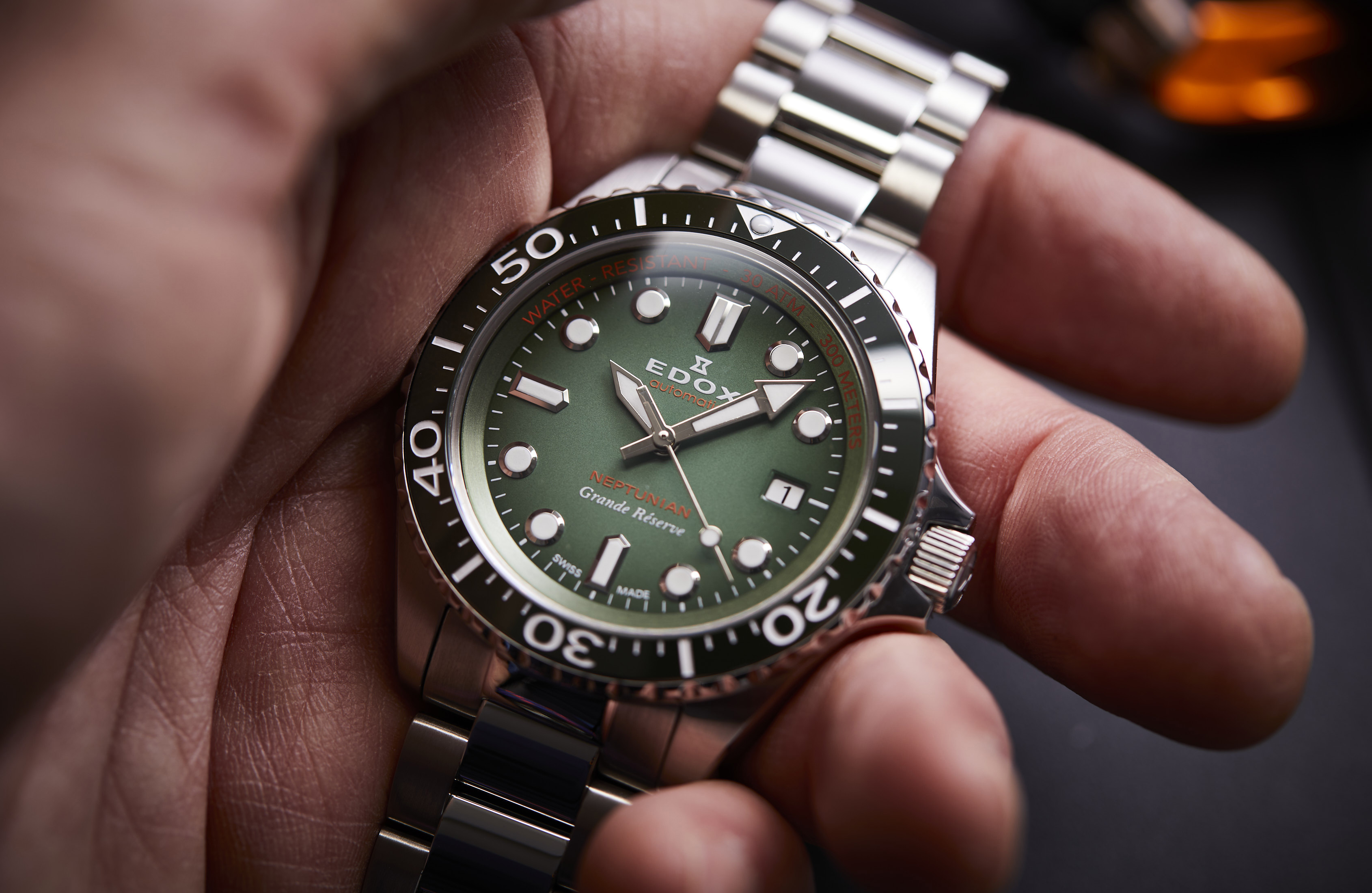 Conçue pour résister à une pression de 30 ATM (300 mètres), ce modèle est équipé d'une couronne vissée et du système de double joint torique breveté par Edox. Ces caractéristiques assurent une étanchéité exceptionnelle, faisant de la Neptunian un compagnon idéal pour les plongeurs professionnels ou en loisir. O'Clock Store vous recommande après chaque sortie en eau de mer de rincer soigneusement votre montre à l'eau claire et de la sécher à l'aide d'un chiffon doux.